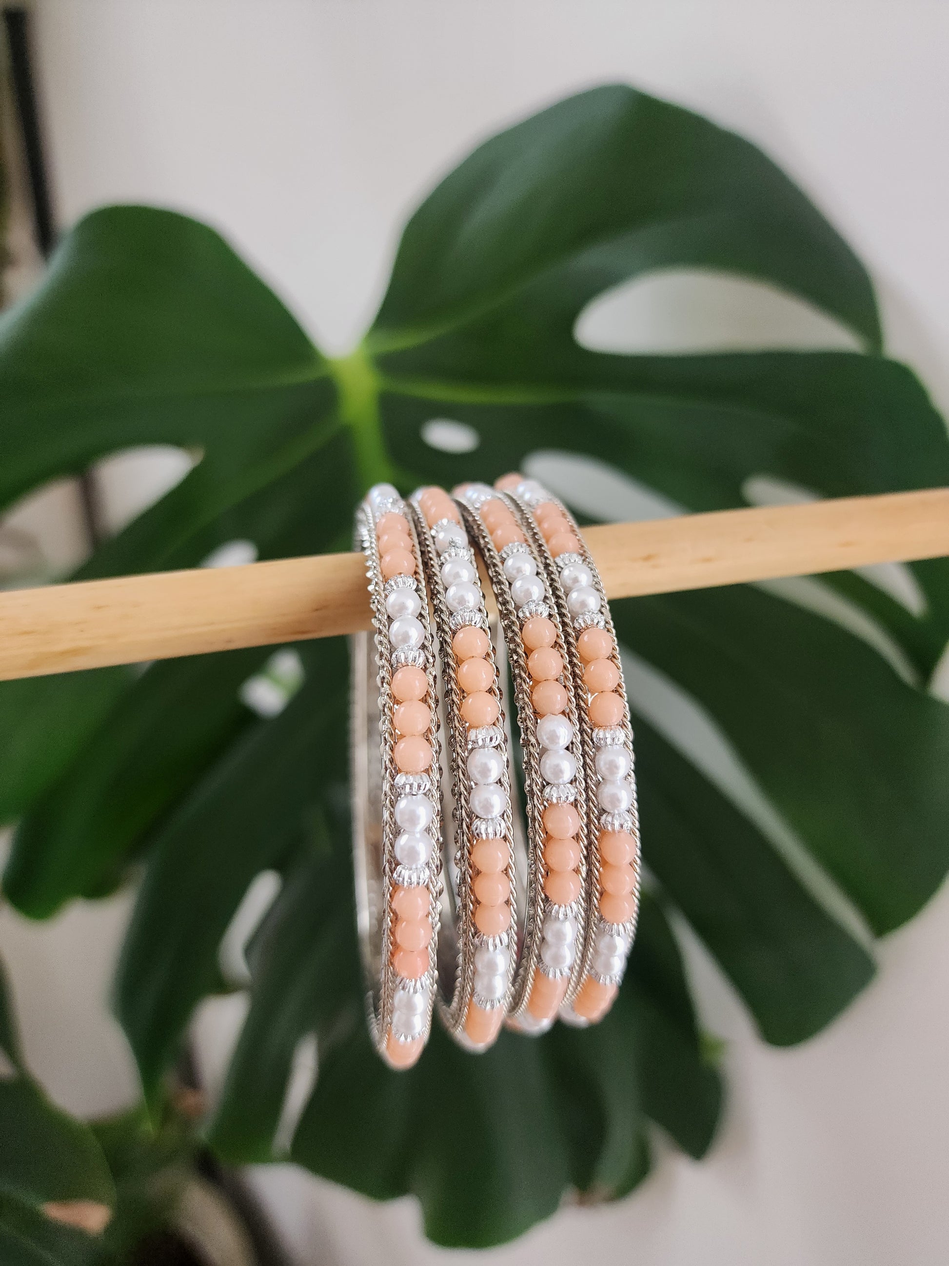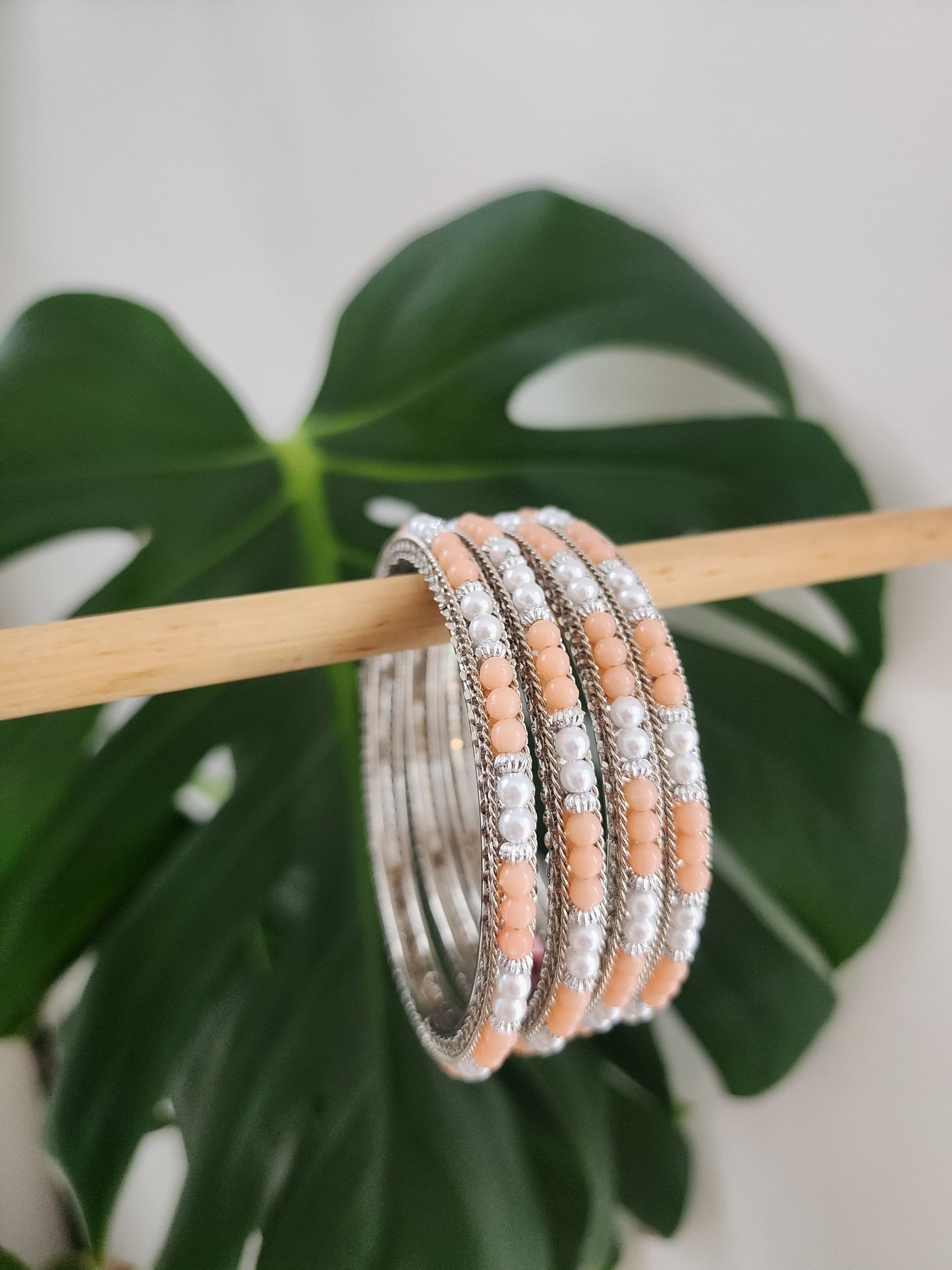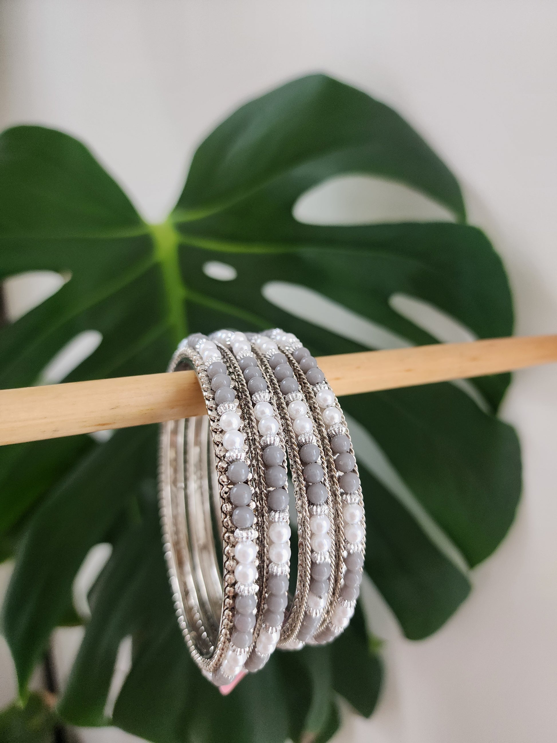 Expertly crafted, Meera's 2.10 size silver bangles come in a set of two, available in two elegant combinations: grey & white pearls or peach & white pearls. Enhance your style and elevate any outfit with these sophisticated bangles.