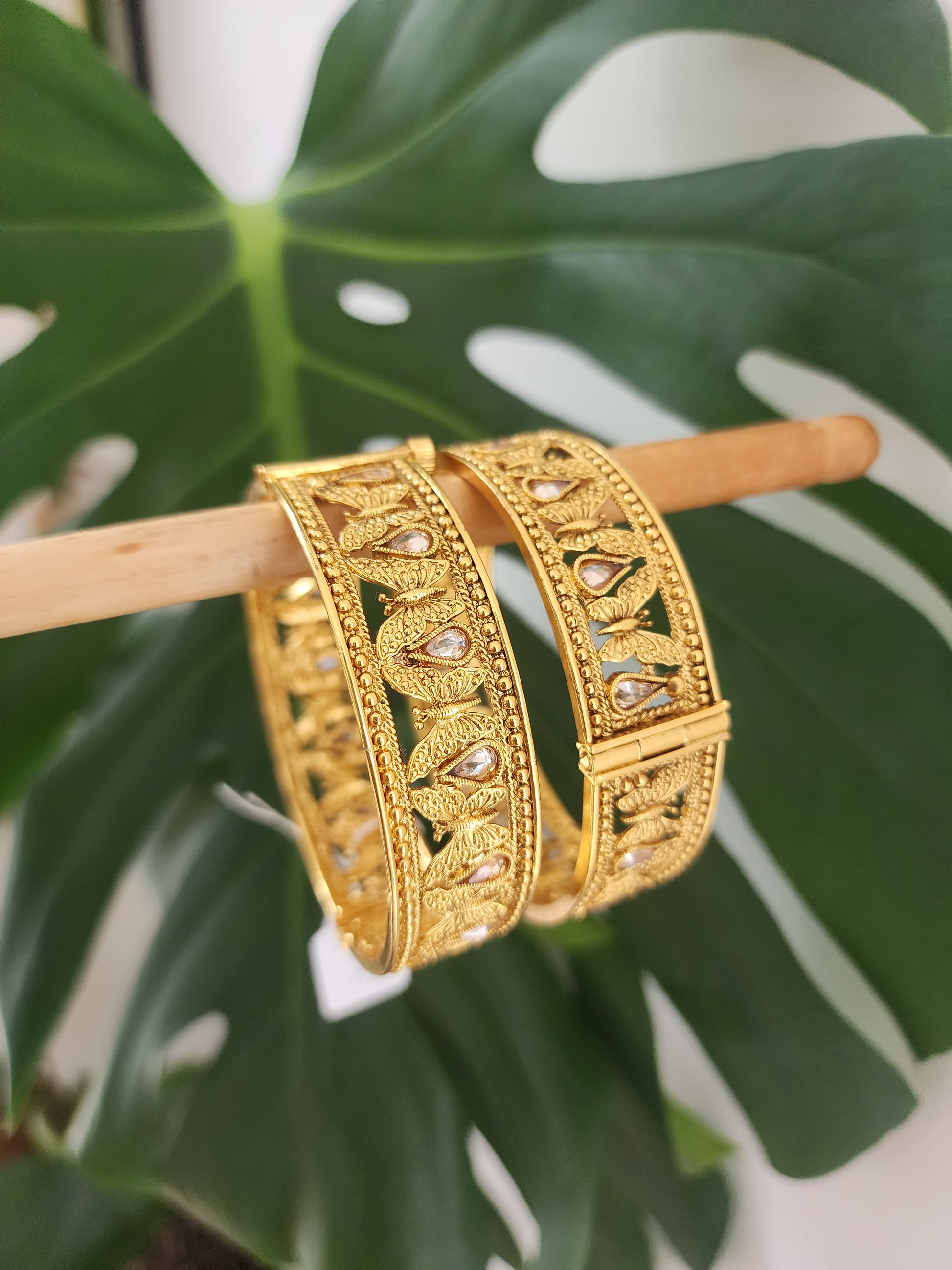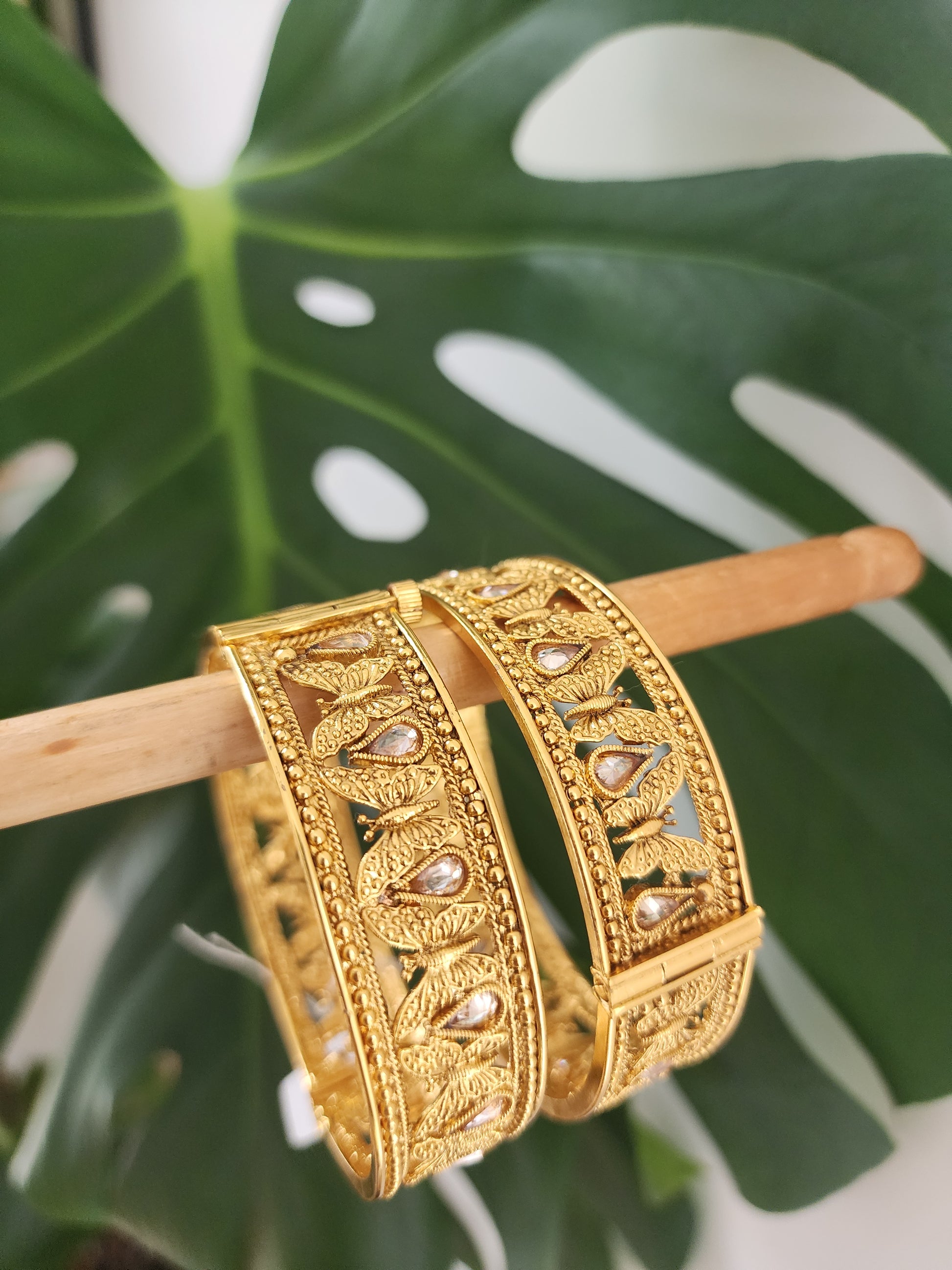 Sania bangles are crafted with durable, gold-plated materials, making them a luxurious addition to any outfit. This set comes with two bangles that can be easily adjusted for the perfect fit. Elevate your style with the elegant and versatile Sania bangles.